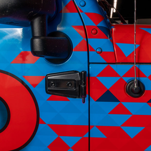 Find it a pain in the ass to put your Jeep doors back on? Check out TMR's door pin guides. Simply screw one onto the top pin of each door. The extended length allows the pin to find its way into the hinge, making it easier to align the lower pin. Another nice benefit - they're machined from Delrin so they won't scratch or chip your paint.